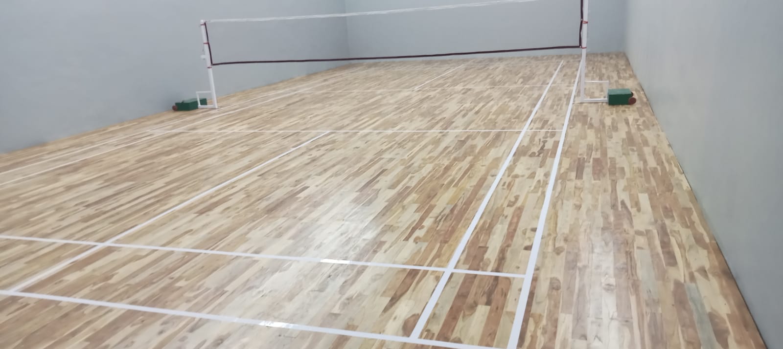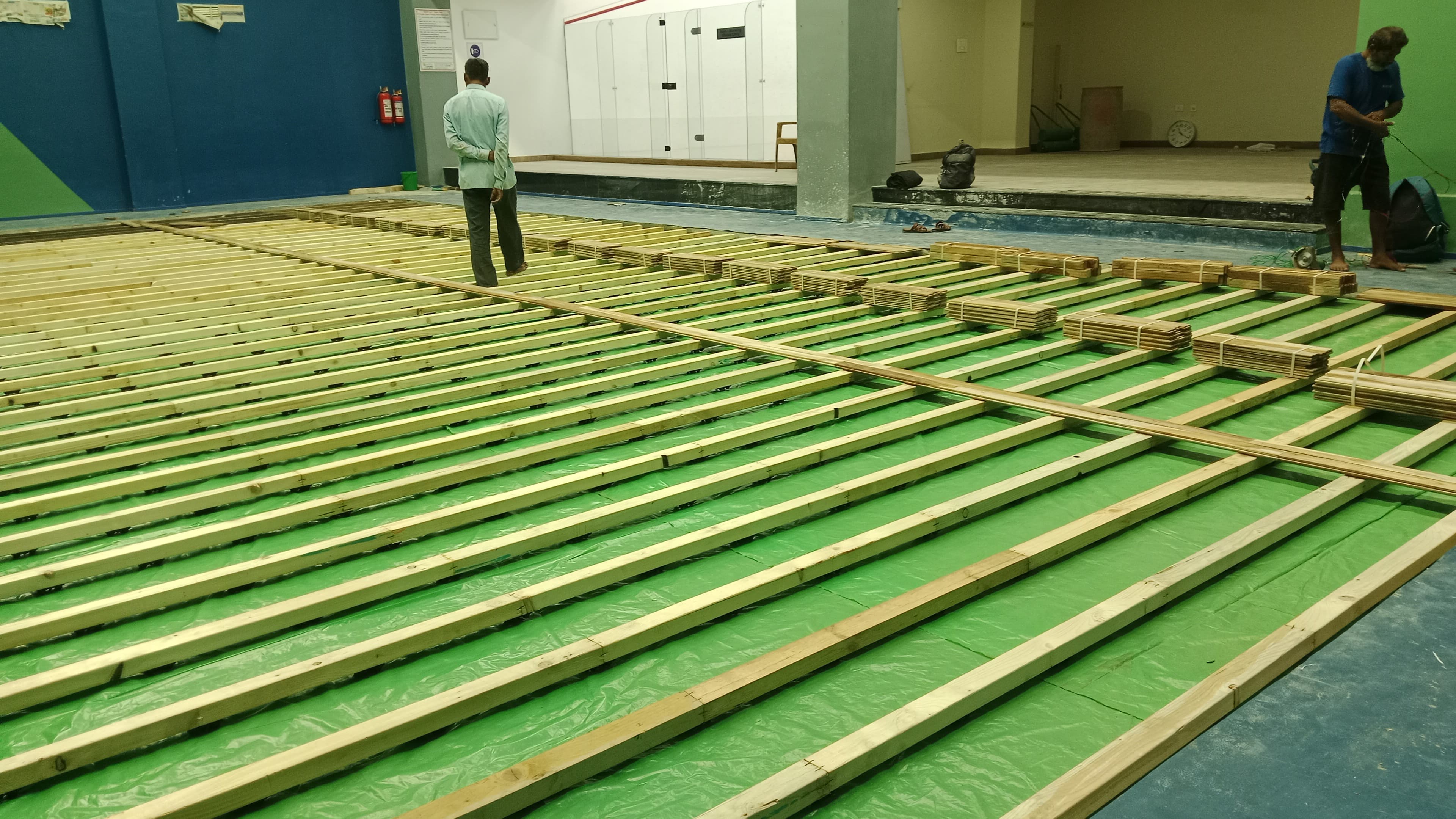 Supply, Installation and finishing of Aero float wooden sports flooring system. Thick 20mm width 60-70mm and random length in tongue and groove shape. The edges of the boards will have groove and the bottom side will have air pass groove and with application of polyurethane lacquer dimension 70mmX45mm treated with anti termite solution and will be fixed on the bottom side with a thickness air-cell cushioning pads by staple through the two wings at 350mmc/c & 19mm cushion goti pad.